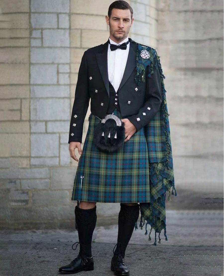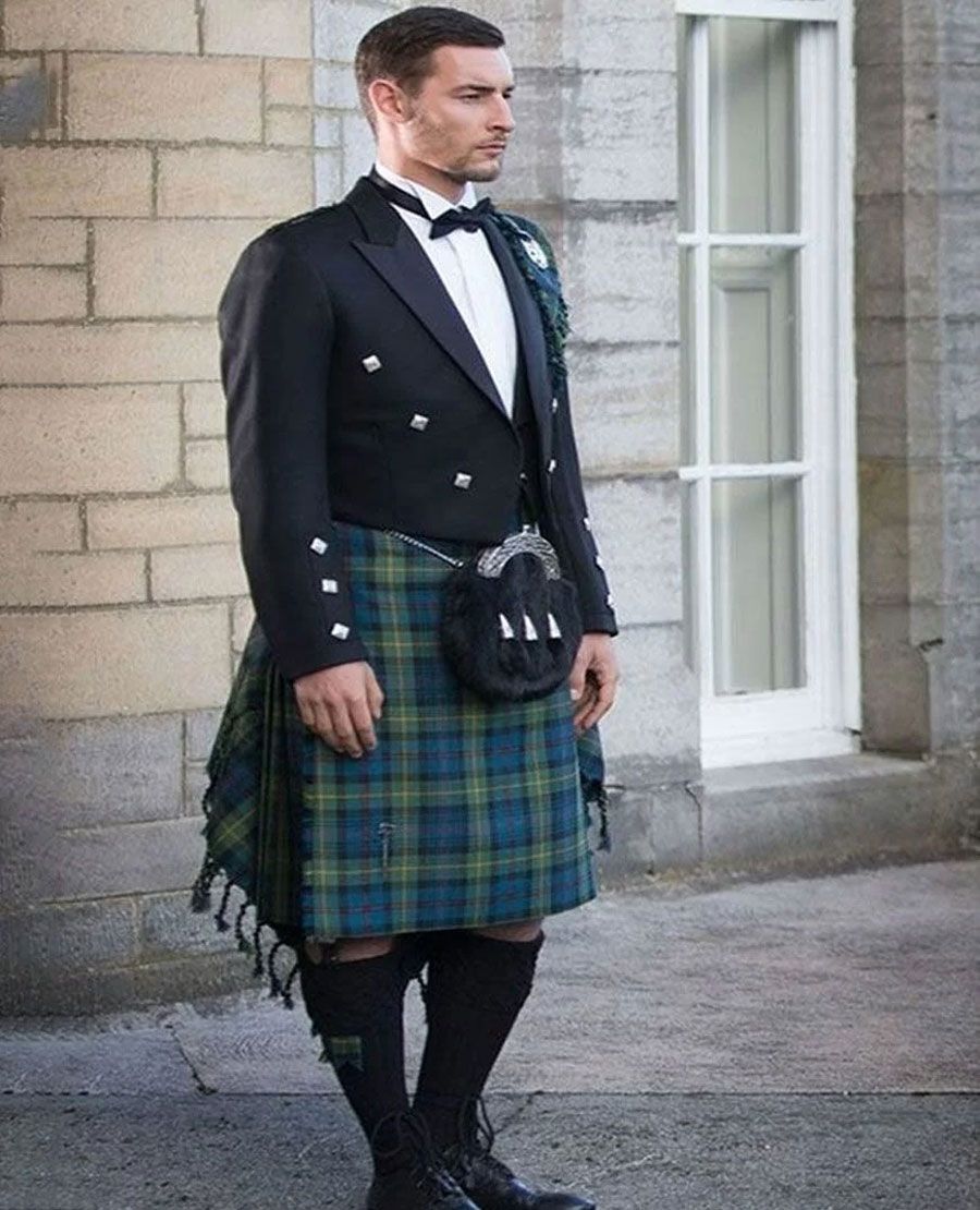 Our premium Prince Charlie full kilt outfit for wedding occasions includes a traditional tartan kilt, Prince Charlie jacket, sporran and complete accessories for an elegant Highland look. Custom made for comfort, quality and formal Scottish style.
